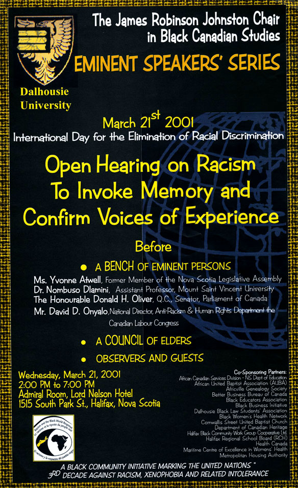 For all these reasons and because of its mandate to bring Black culture, reality, perspectives, experiences and concerns into the Academy, the James Robinson Johnston Chair in Black Canadian Studies is very proud to co-sponsor, within the context of its Eminent Speakers' Series this afternoon's Open Hearing To Invoke Memory and Confirm Voices of Experience. And this is appropriate.